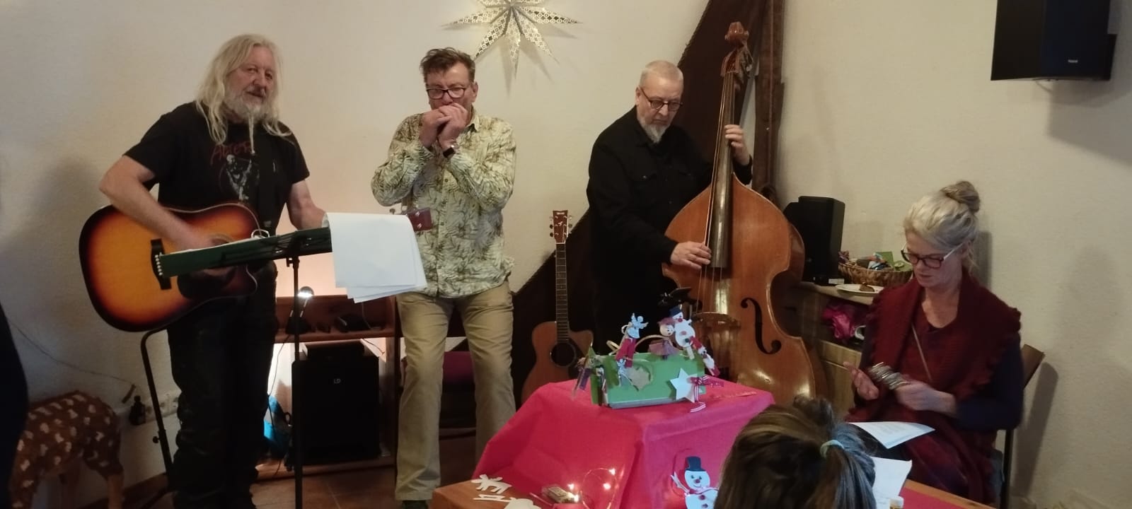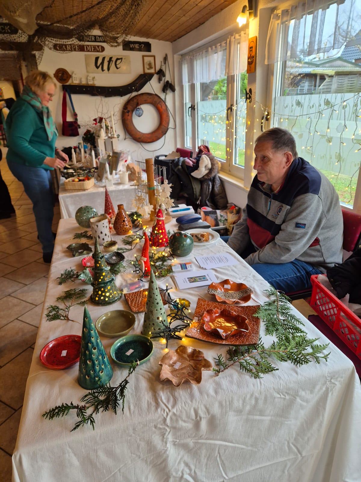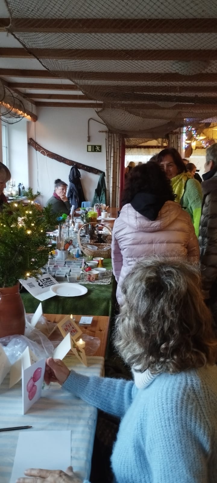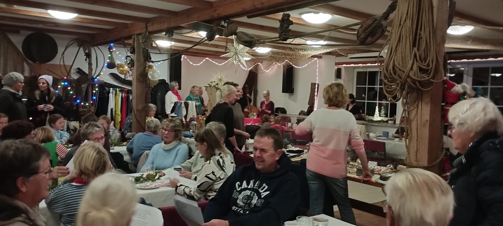 Dieses Jahr hat der Kulturverein bei den Planungen seines mittlerweile traditionellen Adventsmarktes in der Gaststätte „Am alten Hafen“ einen Schwerpunkt auf Selbst-Mach-Angebote für Geschenke an Lieben oder sich selbst gelegt: Es konnten Advents- und Weihnachtskarten aquarelliert oder Sandkerzen und Baumschmuck hergestellt werden, Keramiktassen oder -teller mit Farbe gestaltet und später nach dem Brennen abgeholt oder aber mit Heilsteinen charmante Armbänder kreiert werden. Es war berührend anzusehen, mit wieviel Freude, Liebe und Lust dieses Angebot wahrgenommen und mit welchem Stolz das eigene Werk gezeigt wurde. Dies gilt ebenso für den „Fuhlendorfer Adventsvolkschor“: In Anlehnung an Goethes Osterspanziergang könnte man ausrufen: Nicht „dieses Gewimmel möchte ich sehen“, sondern: „Dieses Singen möchte ich hören“! Aber hört selbst im unteren Videoausschnitt rein. Und hier an dieser Stelle sei auch mit großem Dank festgehalten: Die Band mit ihrer selbst angekündigten „handgemachten Live-Musik aus der musikalischen Mottenkiste“ war grandios und hat die Stimmung im Saal weihnachtlich eingefärbt.