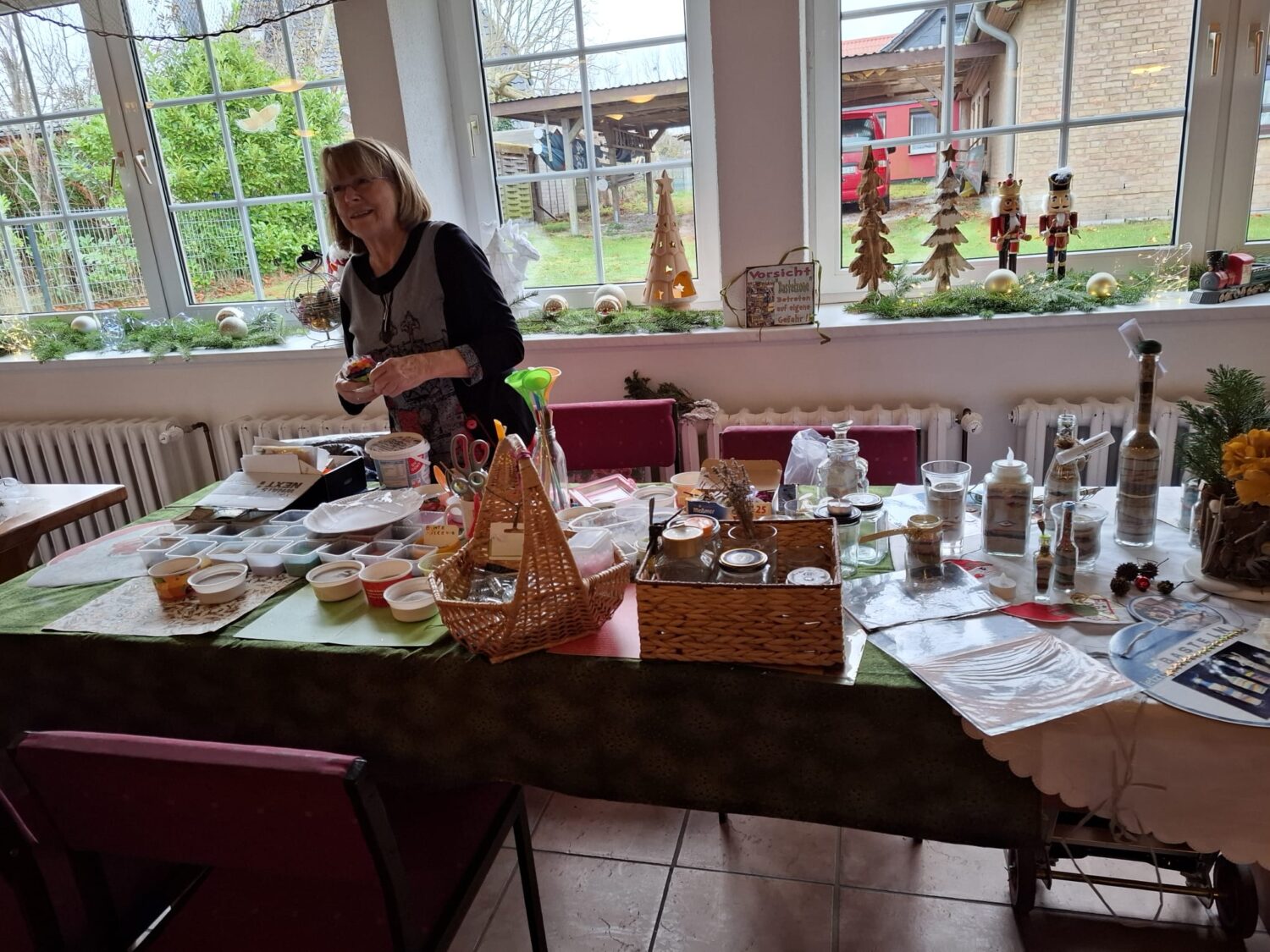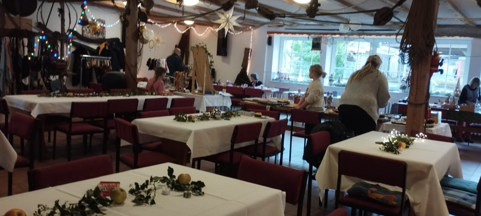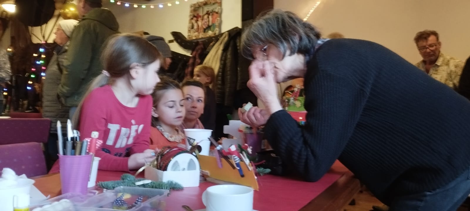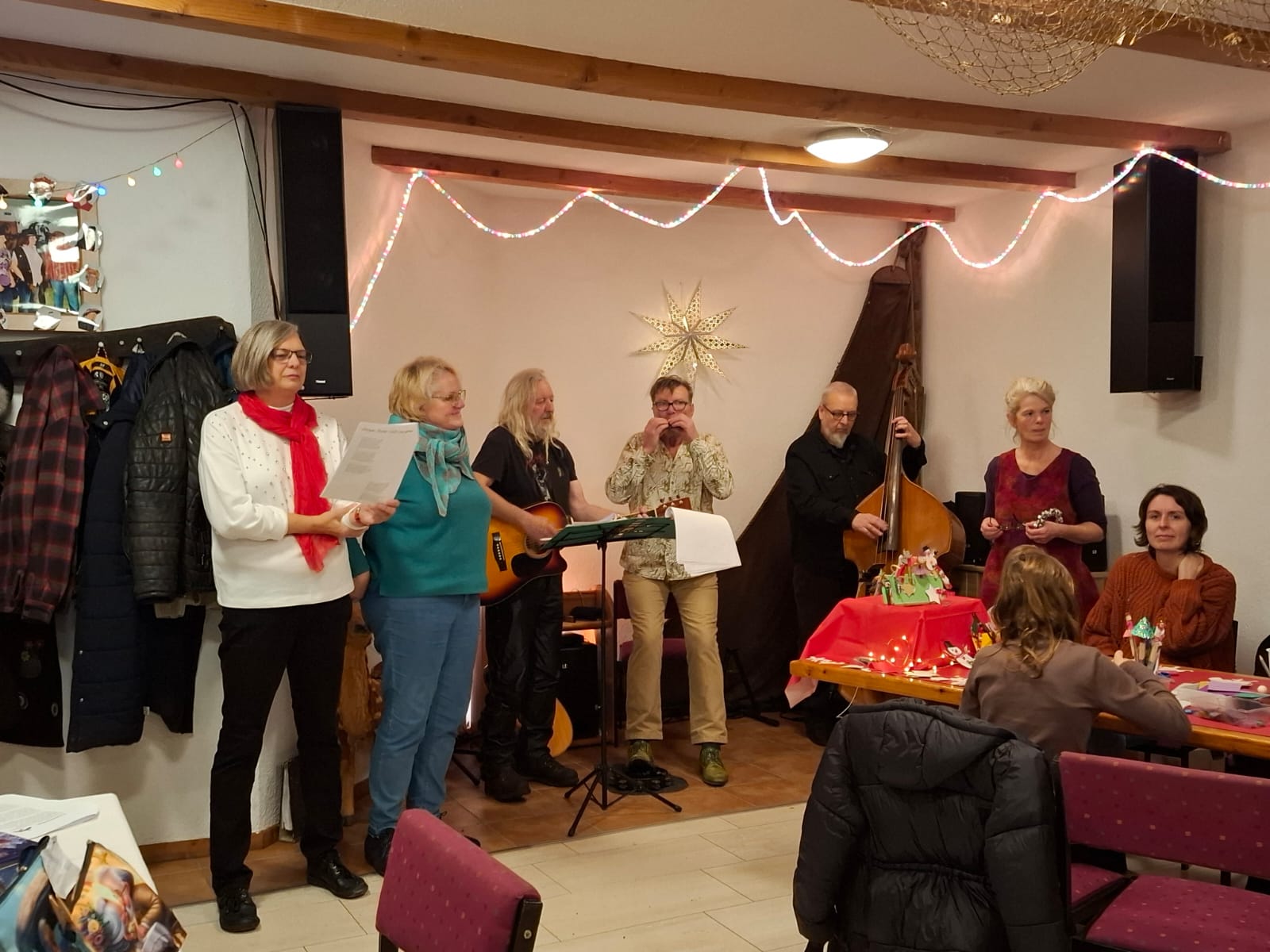 Dieses Jahr hat der Kulturverein bei den Planungen seines mittlerweile traditionellen Adventsmarktes in der Gaststätte „Am alten Hafen“ einen Schwerpunkt auf Selbst-Mach-Angebote für Geschenke an Lieben oder sich selbst gelegt: Es konnten Advents- und Weihnachtskarten aquarelliert oder Sandkerzen und Baumschmuck hergestellt werden, Keramiktassen oder -teller mit Farbe gestaltet und später nach dem Brennen abgeholt oder aber mit Heilsteinen charmante Armbänder kreiert werden. Es war berührend anzusehen, mit wieviel Freude, Liebe und Lust dieses Angebot wahrgenommen und mit welchem Stolz das eigene Werk gezeigt wurde. Dies gilt ebenso für den „Fuhlendorfer Adventsvolkschor“: In Anlehnung an Goethes Osterspanziergang könnte man ausrufen: Nicht „dieses Gewimmel möchte ich sehen“, sondern: „Dieses Singen möchte ich hören“! Aber hört selbst im unteren Videoausschnitt rein. Und hier an dieser Stelle sei auch mit großem Dank festgehalten: Die Band mit ihrer selbst angekündigten „handgemachten Live-Musik aus der musikalischen Mottenkiste“ war grandios und hat die Stimmung im Saal weihnachtlich eingefärbt.